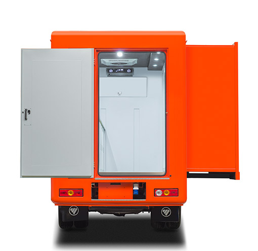 五檔手動(dòng)變速、轉(zhuǎn)向助力、空調(diào)、電子中控鎖,廂體部位:地板總成、箱體總成、裙箱總成、上車門、觀察窗、配電柜、電池、充電機(jī)、工業(yè)連接器、照明配電總成、外部燈光總成、吊柜、臺(tái)面總成、電磁爐、冰箱、上下鋪、便攜式發(fā)電機(jī)、LED屏(側(cè)面)總成系統(tǒng)、音箱、功放機(jī)、車廂內(nèi)部裝飾等。