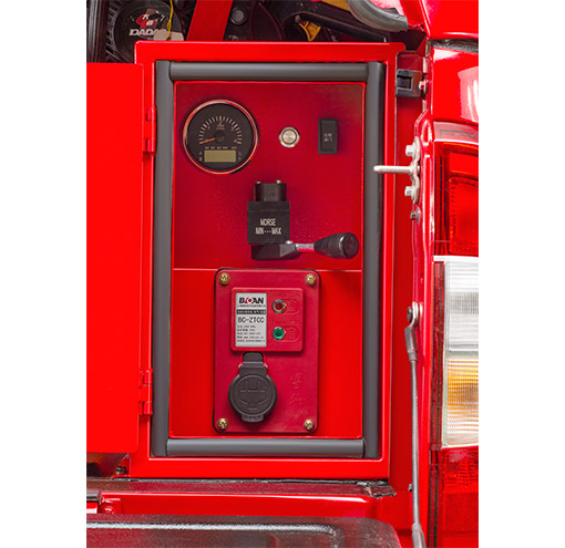 一:六檔手動(dòng)變速、非承載式車身、四輪驅(qū)動(dòng)(分高速四驅(qū)、低速四驅(qū))、帶取力器、遠(yuǎn)程電控油門、后部水溫表及轉(zhuǎn)速表、轉(zhuǎn)向助力、ABS防抱死剎車、多功能方向盤、MP5、電動(dòng)玻璃、中控門鎖、主駕座椅手動(dòng)6向調(diào)節(jié)、副駕座椅手動(dòng)4向調(diào)節(jié)、剎車輔助、倒車?yán)走_(dá)、發(fā)動(dòng)機(jī)防盜、電動(dòng)外后視鏡、LED日行燈、主駕駛安全氣囊、電動(dòng)空調(diào)、一鍵啟動(dòng)、警燈、警報(bào)、宣傳擴(kuò)音器。